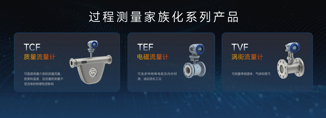 过程测量新产品:TCF质量流量计、TEF电磁流量计、TVF涡街流量计。以“多场景适配、高精度覆盖”为核心优势,形成从常规压力到超高压、从气体到液体的全产业链计量矩阵。